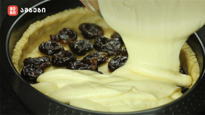 ფორმაში მოთავსებულ ცომზე დაალაგეთ შავი ქლიავის ან ნებისმიერი ჩირი და დაასხით ხაჭოს გულსართი.