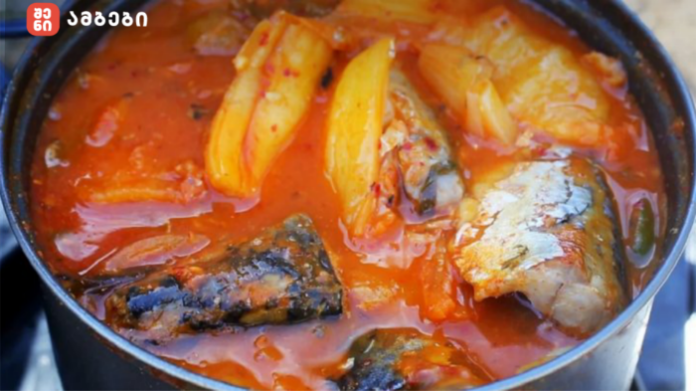 თევზი გაასუფთავეთ, დაჭერით საშუალო ნაჭრებად, გარეცხეთ და ჩაალაგეთ ქვაბში ისე, რომ სოუსით მთლიანად დაიფაროს. დაახურეთ თავსახური და 20 წუთის განმავლობაში ადუღეთ დაბალ ცეცხლზე. უგემრიელესია, მიირთვით ნოყიერ გარნირთან ერთად. კარგია ბრინჯთან და კარტოფილის პიურესთან ერთად.