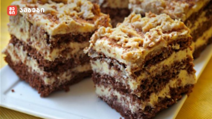 ტორტი კიდევ უფრო გემრიელი გახდება, თუ მაცივარში რამდენიმე საათით გააჩერებთ. სურვილისამებრ მოაყარეთ კაკაოს ფხვნილი ან გახეხილი მწარე შოკოლადი.