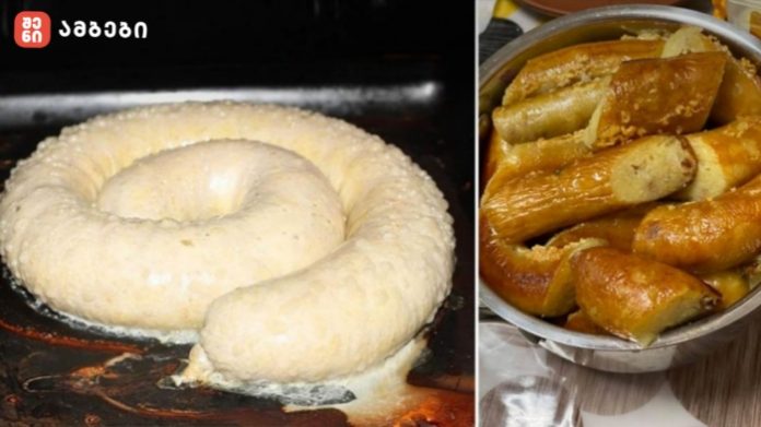 ნაწლავის ერთი ბოლო ძაფით დავამაგროთ და დავიწყოთ მისი ამოვსება მომზადებული მასით. მნიშვნელოვანია, რომ ნაწლავი შეივსოს ნახევარზე ოდნავ მეტად, რათა გამოცხობისას არ გასკდეს. ამოვსების შემდეგ მეორე ბოლოც ძაფით დავამაგროთ.