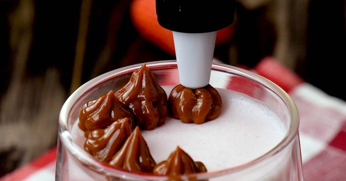 ათქვიფეთ ნაღები, დაამატეთ ჟელატინის ნარევი და აურიეთ. ჭიქები შეავსეთ ნაღები-ჟელატინის მასით და მოათავსეთ მაცივარში 1,5 საათის განმავლობაში. დაამშვენეთ დესერტი შედედებული რძით საკონდიტრო ტომარის გამოყენებით. გამოიყენეთ დრაჟეები დეკორაციისთვის.
