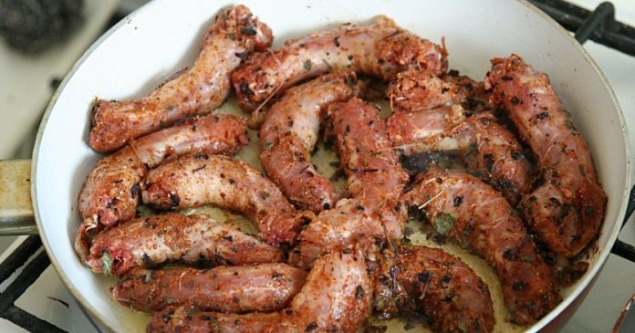 დაჭერით ნიორი წვრილად და ჩაყარეთ გაცხელებულ ტაფაზე ზეთში და შეწვით. როდესაც ნიორი ოქროსფერი გახდება, გადადით შემდეგ საფეხურზე, გაწურეთ კისრები და შეუწვით კანი ერთ მხარეს. ამას მაქსიმუმ 3-4 წუთი დასჭირდება. შემდეგ გადაბრუნდით მეორე მხარეს და ძალიან კარგად შეწვით. ტექნიკა მოგვაგონებს სოსისის მომზადებას. გახსოვდეთ, რომ კისრები ურიეთ, რომ თანაბრად მოიხარშოს.