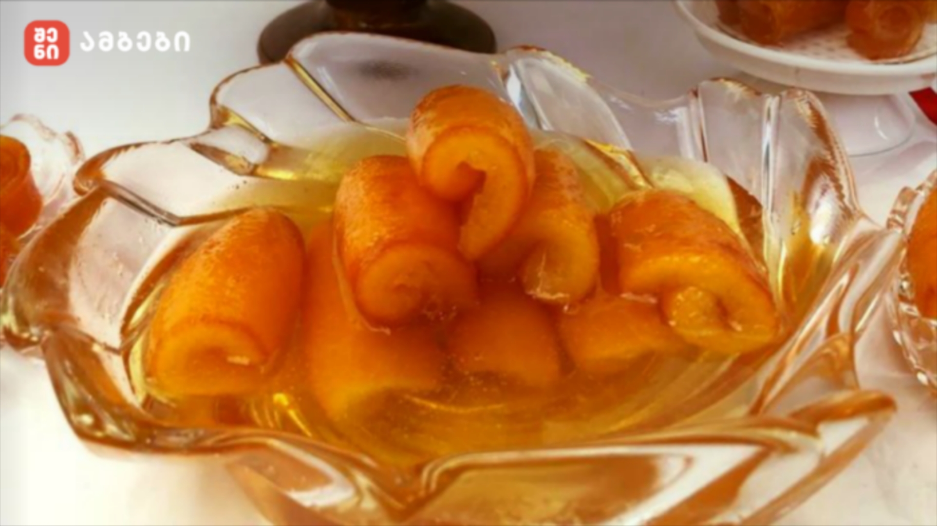 4 ცალი ფორთოხალი ( საშუალოზე დიდი ზომის ) სქელ კანიანი, გავრეცხოთ, გავამშრალოთ კარგად და შემოვაცალოთ გარედან ცედრა წვრილი სახეხის გამოყენებით, შემდეგ გავაცალკევოთ ნაყოფისაგან კანი, ნახევარმთვარის ფორმით, შემდეგ დავახვიოთ რულეტივით და სათითაოთ შევკრათ ხის ჩხირით.