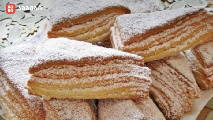 ფენების დასრულების შემდეგ მასა თანაბარ ნაჭრებად დაჭერით. ნაჭრები დაალაგეთ პერგამენტის ქაღალდით დაფარულ საცხობ ფორმაზე.