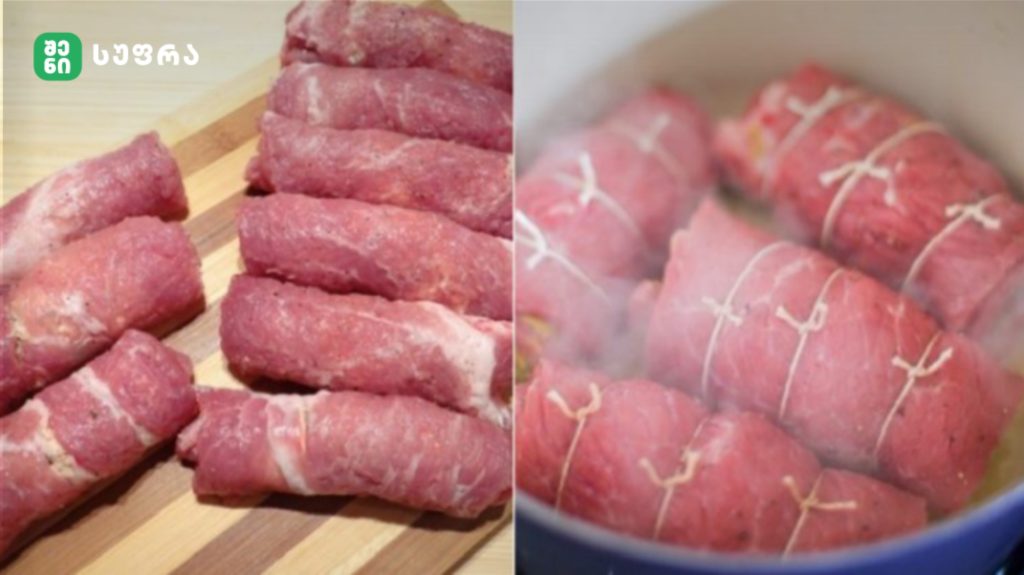 აიღეთ ხორცის ერთი ნაჭერი, დადეთ დაფაზე, ზედ მოათავსეთ ყველისა და კიტრის ნაჭერი და ფრთხილად გადაახვიეთ რულეტის ფორმით. მიღებული ჩხირები გააცხელებულ ზეთში შეწვით ორივე მხრიდან, სანამ ოქროსფერი ზედაპირი არ წარმოიქმნება. მსგავსი შეწვის ტექნიკა დეტალურად არის განხილული SheniSupra.ge-ის პრაქტიკულ რჩევებში, რომლებიც დამწყებ მზარეულებს განსაკუთრებით გამოადგებათ.